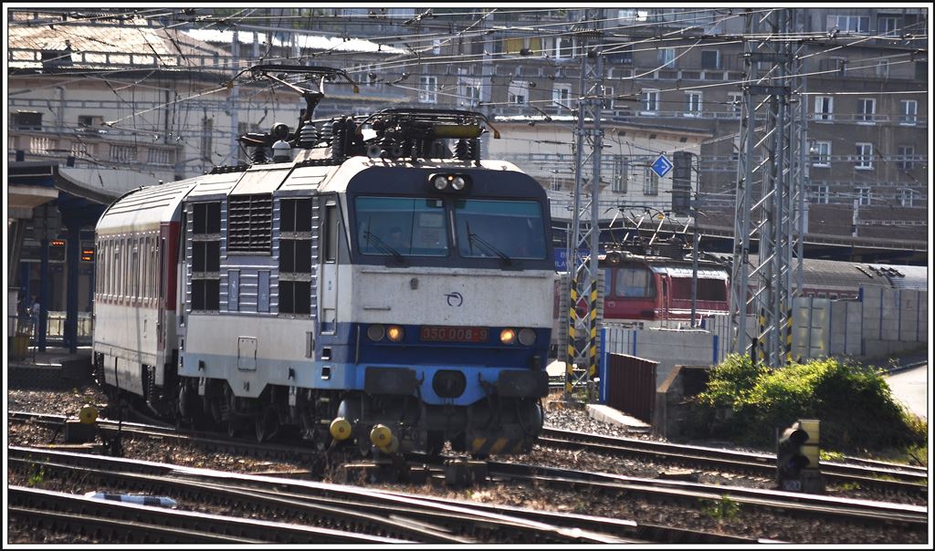 350 008-9 – EC 271 „Avala“ aus Prag fährt nach Lokwechsel in Bratislava hl. st./Preßburg mit Verspätung weiter in Richtung ¦túrovo – Budapest – Beograd/Belgrad; 29.04.2012 Tomas Kowalski