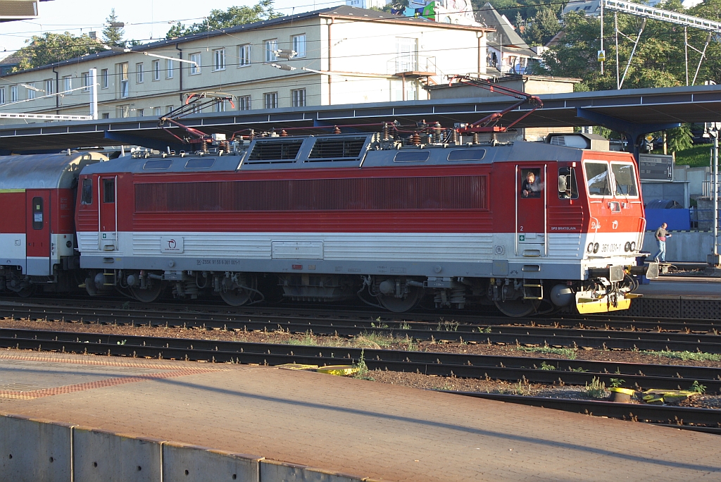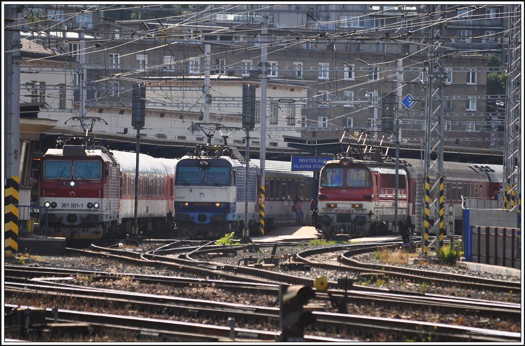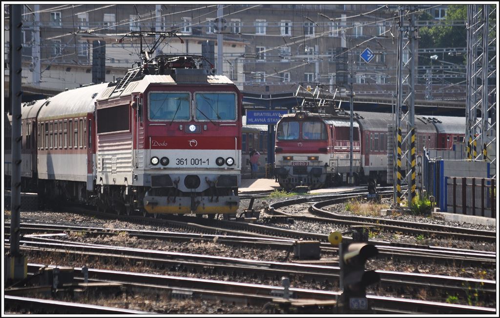 Während die CD-Cargo 230 031-7 am 28.September 2013 im Bf. Bratislava hl.st. auf die Weiterfahrt warten reinigt der Lokführer der ZSSK 361 001-1 die Führerstandsscheiben. Karl Seltenhammer