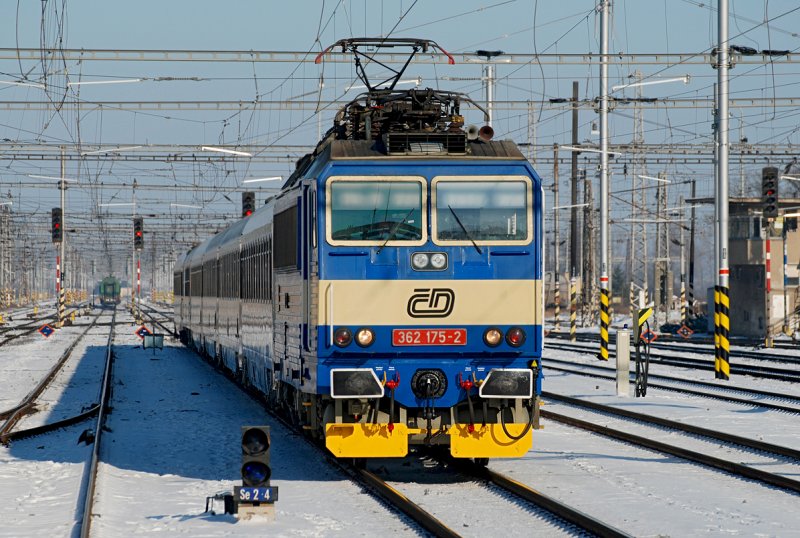 Eurocitiy 103 "Polonia" von Warschau nach Wien wird mit CD 362 175-2 nach Breclav gebracht, um danach durch die ÖBB Reihe 1014 ersetzt zu werden. Das Foto entstand am 08.01.2009.