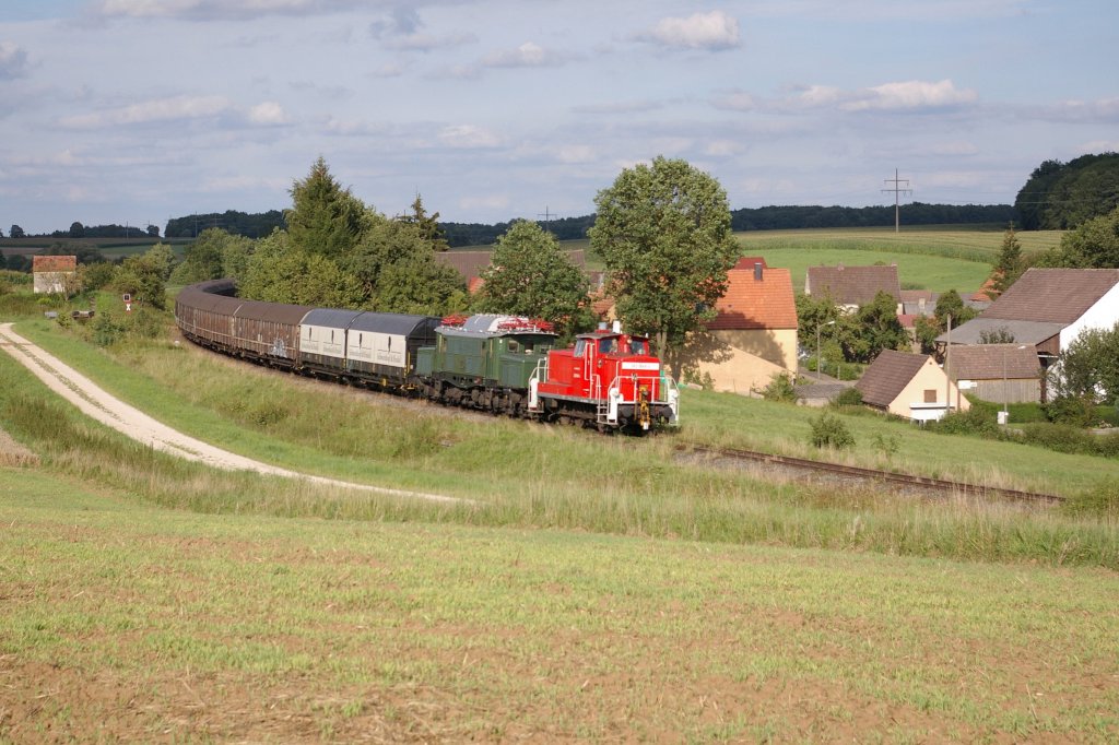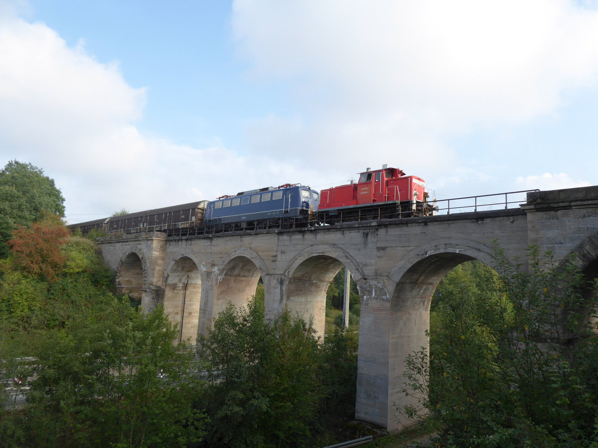 Henkelzug mit 362 848-4 u. 110 262-0 (139 262-0) am 03.09.2018 auf dem Weg nach Wassertrüdingen. Viadkukt bei Unterwurmbach.