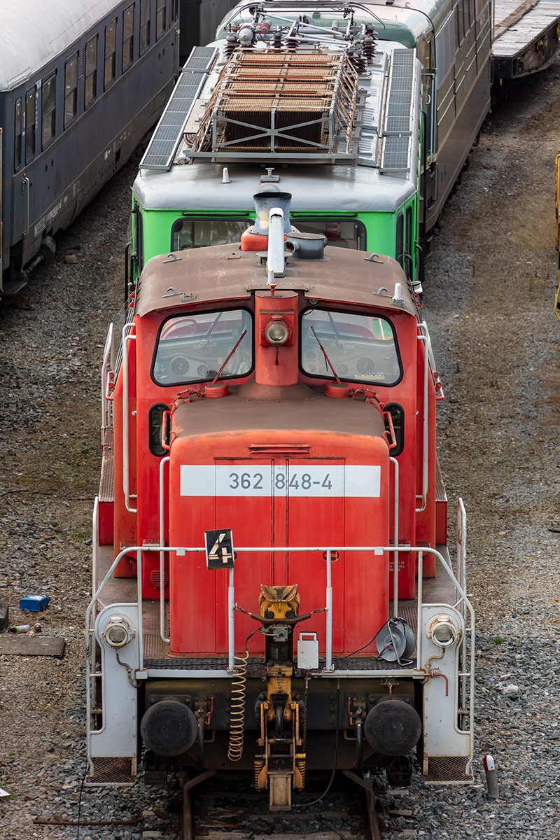 362 848-4 der Bayernbahn am 14.04.2013 im Bw Nördlingen (Bayerisches Eisenbahnmuseum). Unter der Fabriknummer 18610 wurde sie 1960 von Krauss-Maffei gebaut und als V 60 848 bei der DB in Dienst gestellt. 1968 erhielt sie die computergerechte Nummer 260 848-7. Am 01.10.1987 wurde sie zur Kleinlok degradiert und in 360 848-6 umgezeichnet. Am 19.02.1991 wurde sie mit Funkfernsteuerung und automatischer Kupplung ausgerüstet und bekam die Nummer 364 848-2. Am 14.11.2001 erfolgte eine Remotorisierung und eine weitere Umzeichnung in 362 848-4. Am 16.11.2009 wurde die V 60 bei der DB AG z-gestellt und am 25.08.2010 erfolgte die Ausmusterung. Zwei Monate später kam sie zur Bayernbahn GmbH.