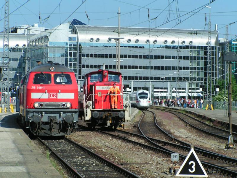 218 348-1 mit RE27001 sowie die "gestresste" Rangierlok 362 848-4 am Bahnsteig 9 bzw. 8 München Hbf (im Hintergrund der "Sonderfahrt" ICE-TD605 am Bahnsteig 7)