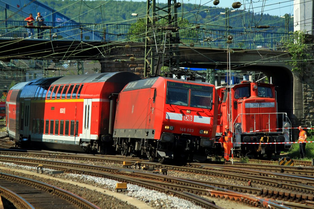 ENTGLEIST! Am 26.05.1 ist 146 023 mit sechs Doppelstockwagen (RE1) am Haken im Aachener Hbf entgleist. Die Lok steht mit Schräglage in einer Doppelkreuzweiche im Schotter, der erste Wagen ist komplett, der zweite mit der Vorderachse entgleist. Auf dem Nachbargleis steht schon 362 939-1 mit einem Gerätewagen. Die Lok soll am Nachmittag mit einem 75to. Kran aufs Gleis gestellt werden. Glück im Unglück, da der Zug im Bahnhof bereit gestellt werden sollte befanden sich keine Reisenden in den Wagen. Die Tf wurde mit einem Schock in`s Krankenhaus gefahren.