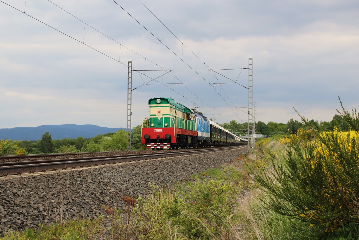 T 669 0001 schleppt die 363 064-7 mit dem Orient-Express hier am 23.05.15 in Stebnice. Es war zwischen Lipova und Cheb der Strom abgeschalten wegen Bauarbeiten.