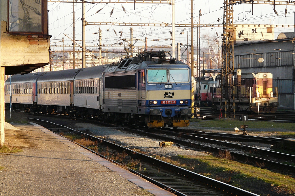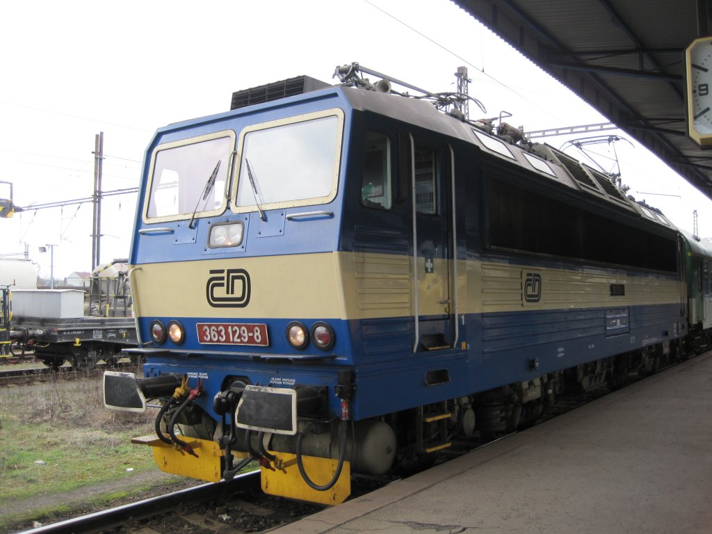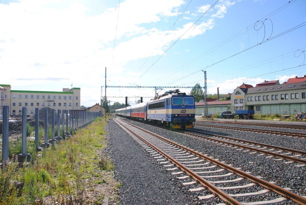 28.8.2010 16:39 ČD Baureihe 363 129-8 mit einem Schnellzug (R) aus Cheb nach Praha hl.n. sowie einem Kurswagen nach Moskva Belorusskaja bei der Einfahrt in den Bahnhof Sokolov. Mitch Schlosser