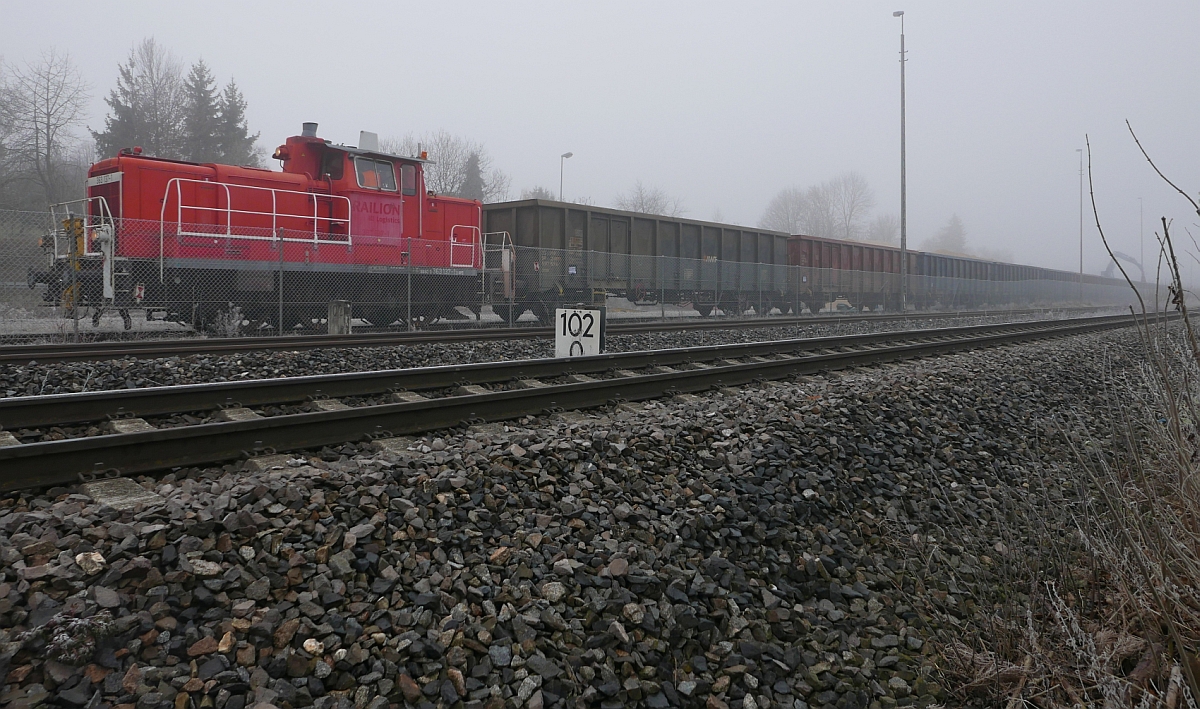 Wo früher die in Ulm-Donautal hergestellten Lkw auf die Bahn verladen wurden, wurde im Dezember Sand für die Neubaustrecke Stuttgart - Ulm von der Bahn auf Lkw verladen. Am 13.12.2016 hat 363 137-1 die mit Sand befüllten Wagen der Gattung Eanos nach Einsingen gezogen.