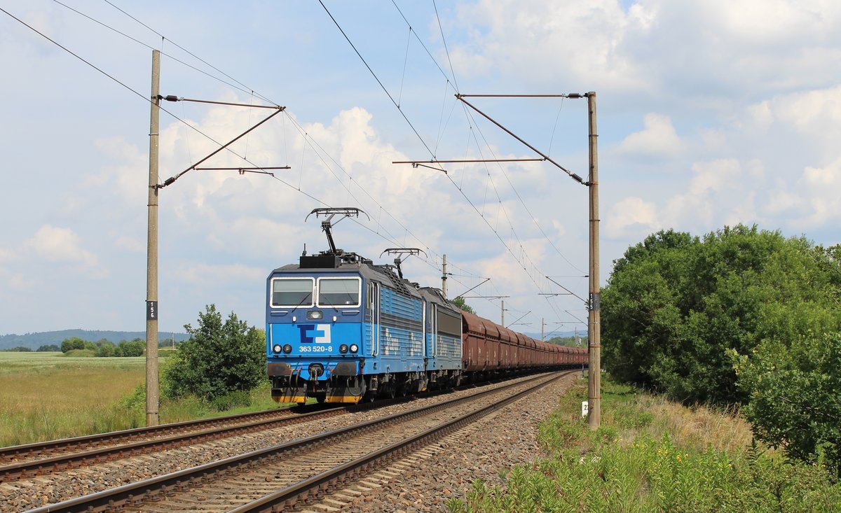 363 520-8 und 363 525-7 zu sehen am 08.06.18 mit dem Kohlezug bei Vokov.
