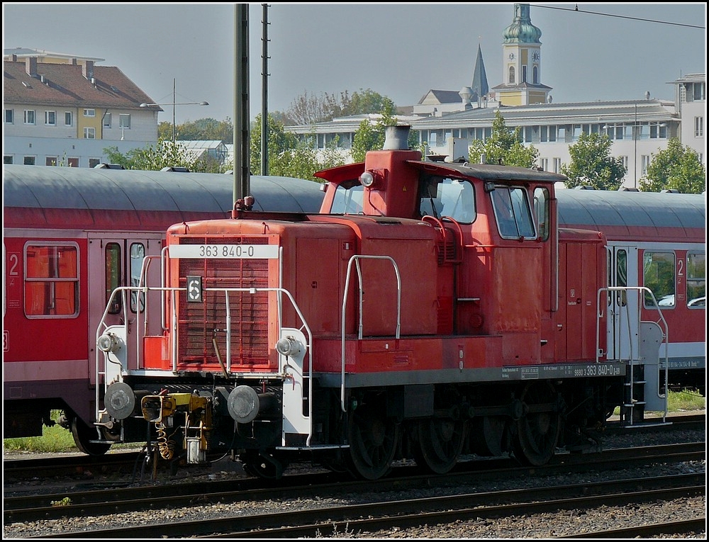 Die Rangierlok 363 840-0 war am 11.09.2010 im Bahnhof von Regensburg abgestellt. (Hans)