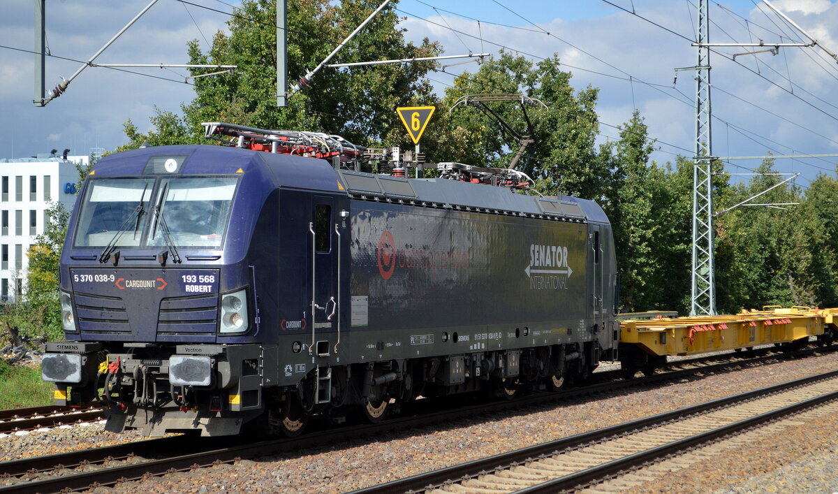 Diedersdorf am 28. September 2023 auf dem südlichen Berliner Ring fährt Industrial Division Sp. z o.o., Wrocław [PL] mit "5 370 038-9/193 568" mit dem Namen: "Robert" (NVR-Nummer: 91 51 5370 038-9 PL-ID) und einem Ganzzug Containertragwagen. Klaus-P. Dietrich
