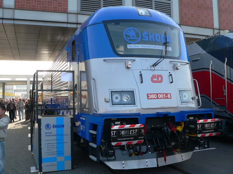 Skoda 380 001-8 am 26.09.2008 auf der Innotrans in berlin. Die Lokomotive wurde bereits mit Crashpuffern der Firma EST ausgerüstet, die im Falle einer Kollision Energie aufnehmen und abbauen können und so schaden an der Lok und an Wagen mindern oder im günstigsten Fall sogar vermeiden können. Wolfgang Koenigsfeld