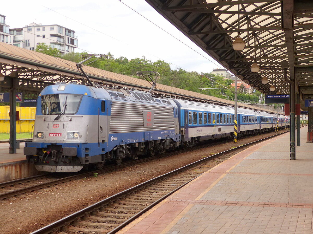 ČD 380 016-6 mit dem EC 277  Metropolitan  nach Budapest-Nyugati, am 08.06.2019 in Praha hl.n..