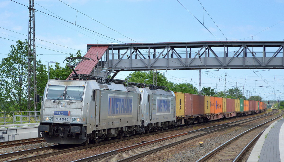 386 012-9 METRANS Rail s.r.o. mit der Wagenlok 386 009-5 und einem Containerzug in Stendal und fuhr weiter in Richtung Salzwedel. 02.06.2017 Stephan Kemnitz