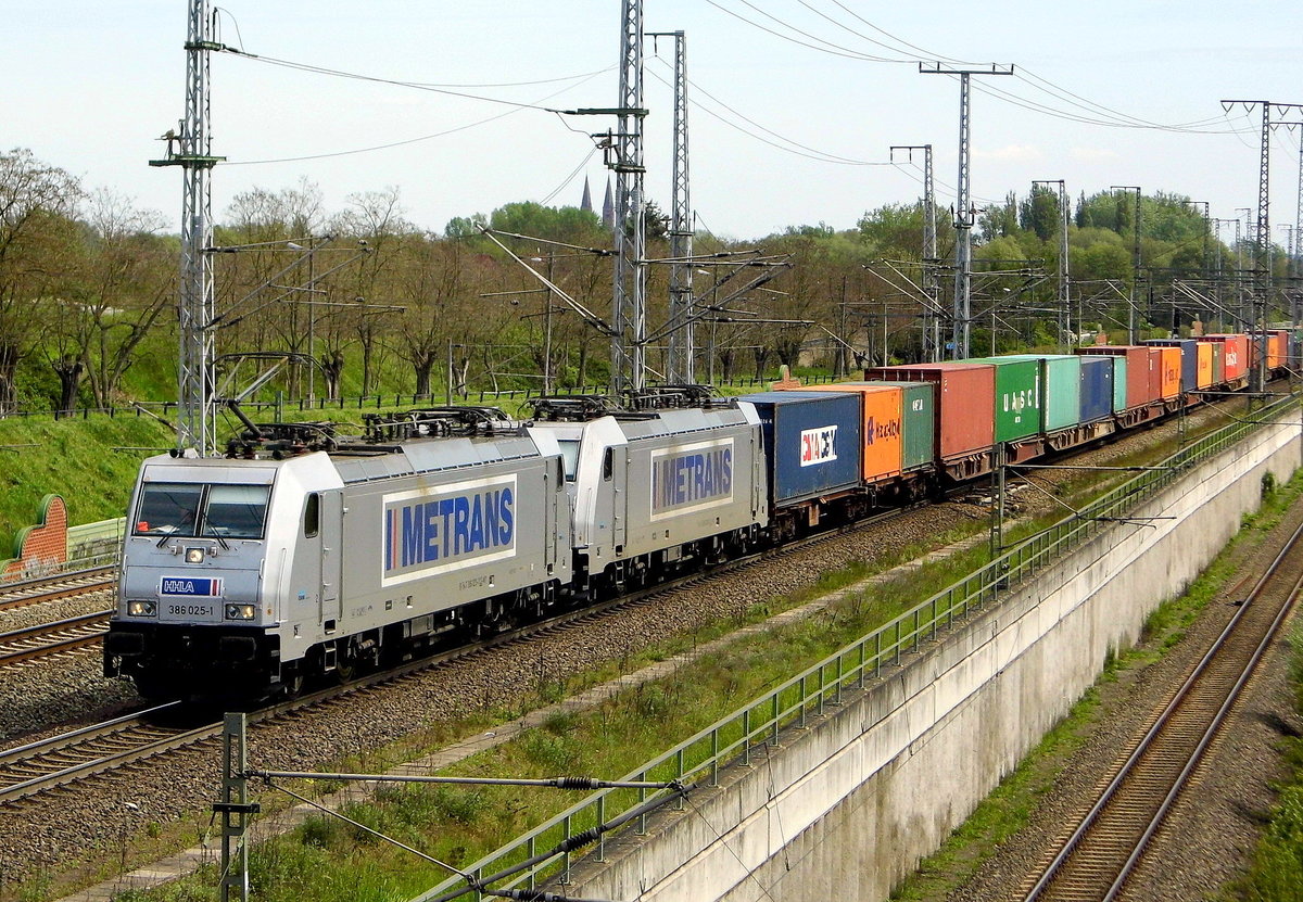 HHLA Metrans Bombardier Traxx 386 016-0 in Hamburg Harburg mit Containerzug am 18.07.25
