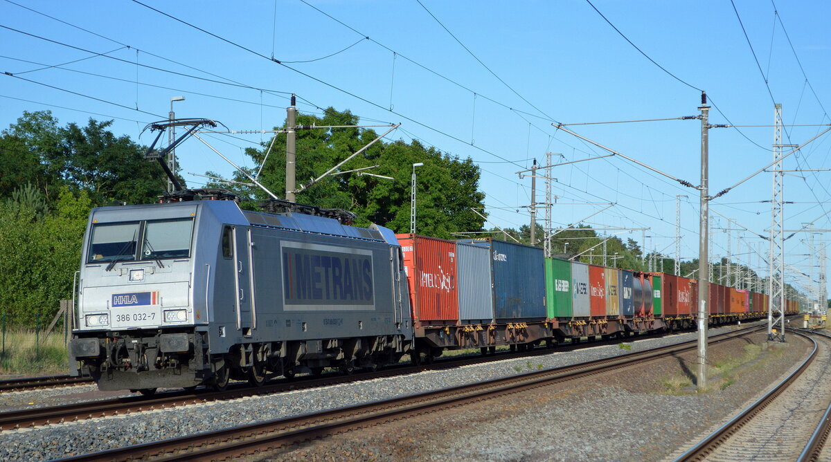 METRANS Rail s.r.o., Praha [CZ] mit "386 032-7" [NVR-Nummer: 91 54 7386 032-7 CZ-MT] und einem Containerzug am 12.07.22 Durchfahrt Bahnhof Glöwen. Lothar Stöckmann