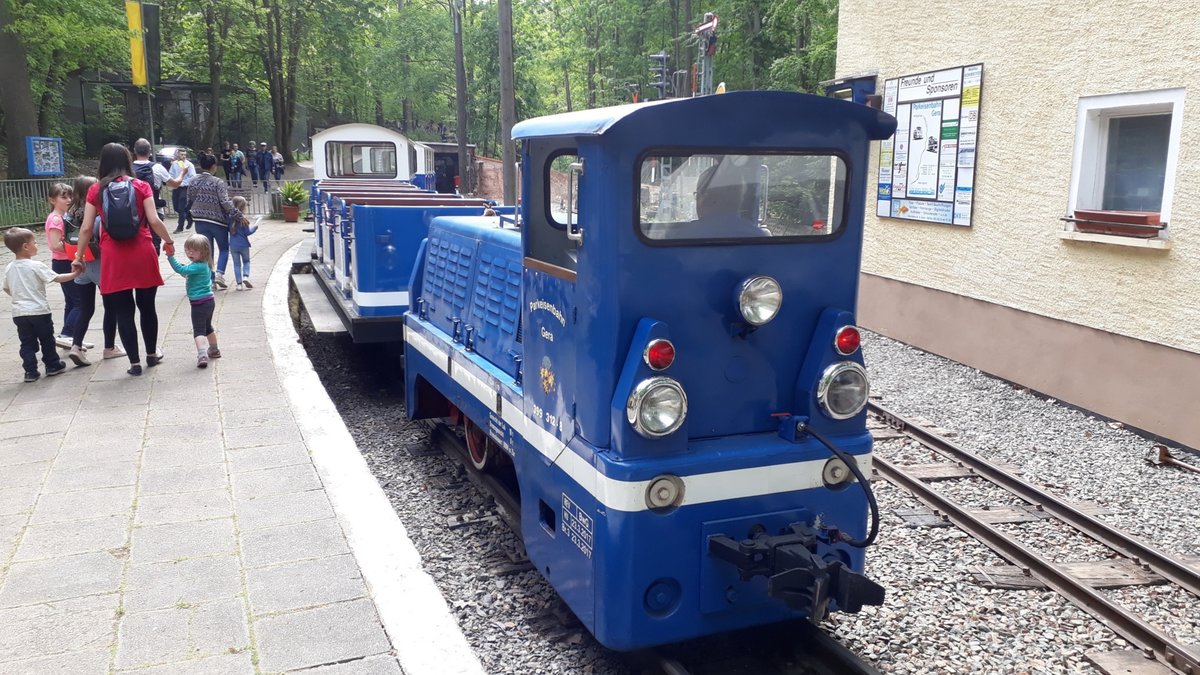 Parkeinsenbahn Gera 399 312-8 mit einem Zug aus dem Bahnhof Martinsgrund, am 22.10.2015 im Bahnhof Wolfsgehege.