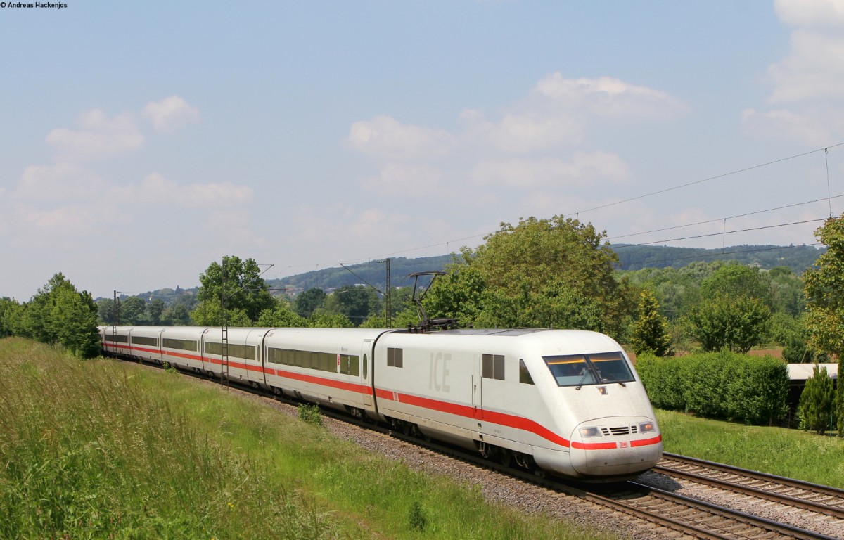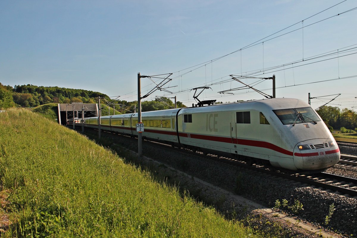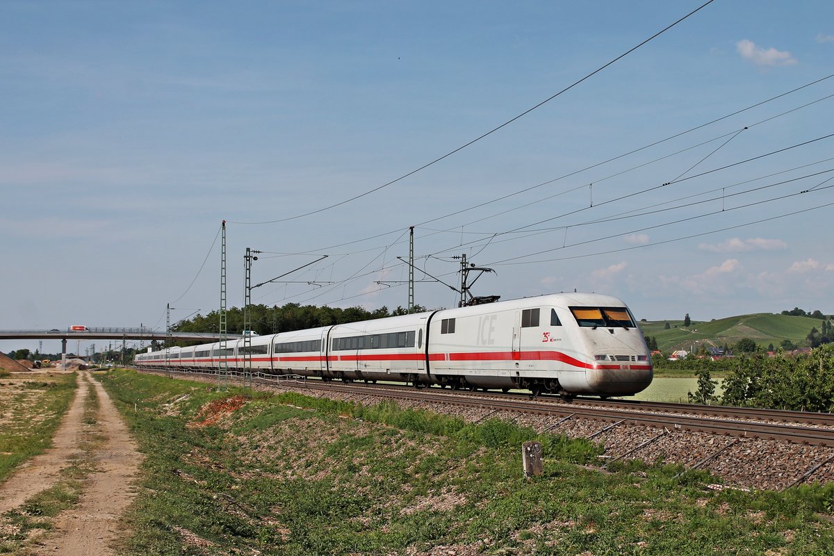 Am Vormittag des 02.06.2020 fuhr 401 081-5 als ICE 275 (Berlin Ostbahnhof - Interlaken Ost) bei Hügelheim über die Rheintalbahn durchs Markgräflerland in Richtung Müllheim (Baden).