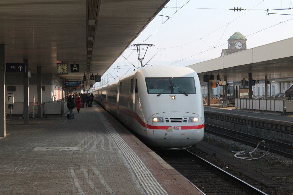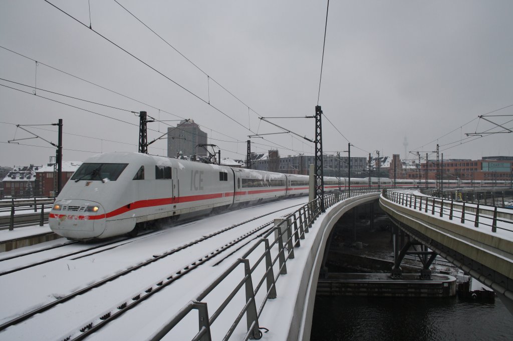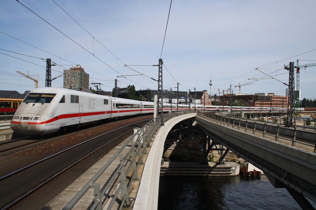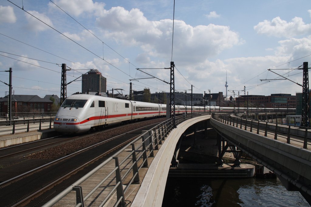 Hier 401 566-5 "Freilassing" als ein ICE12 von Berlin Ostbahnhof nach Interlaken Ost, bei der Durchfahrt am 1.4.2010 durch Berlin Alexanderplatz. Alexander