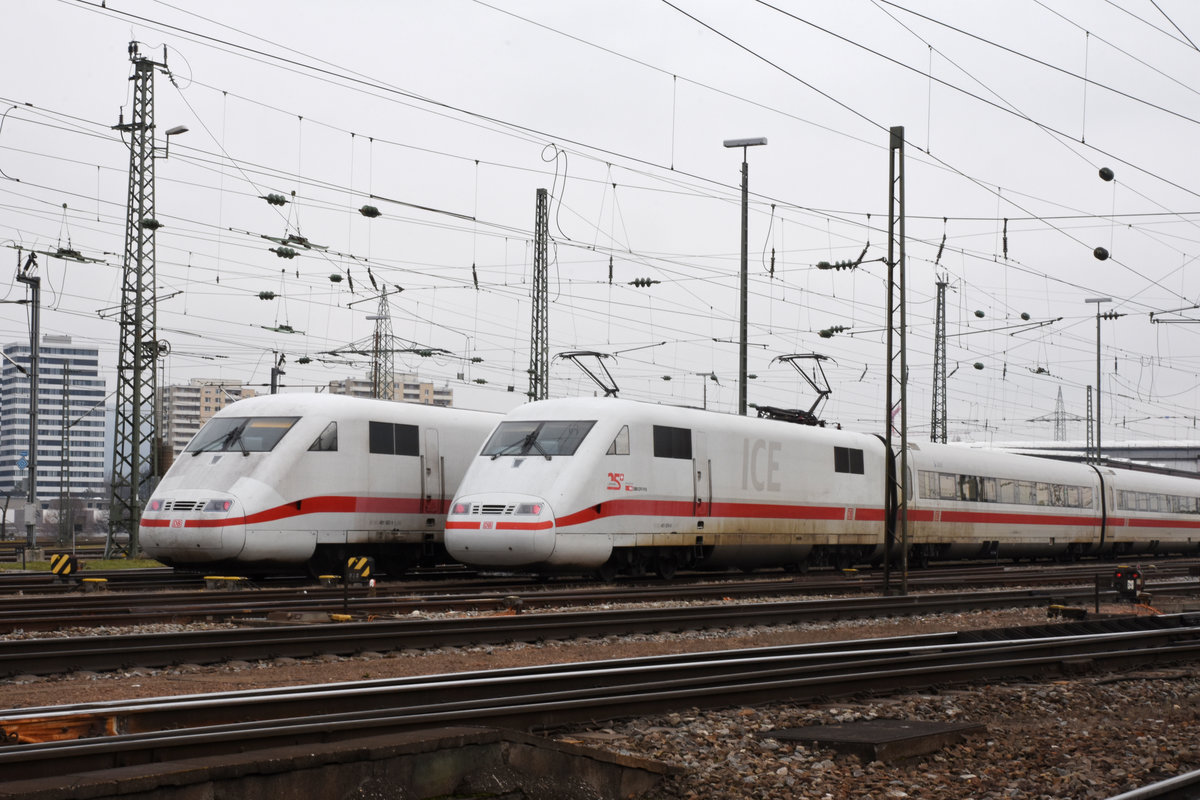 Die zwei ICE 401 587-1 und 401 574-9 sind auf einem Nebengleis beim badischen Bahnhof abgestellt. Die Aufnahme stammt vom 11.01.2019.