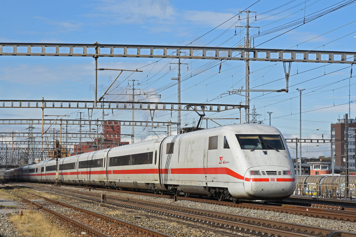 ICE 401 574-9 durchfährt den Bahnhof Muttenz. Die Aufnahme stammt vom 08.11.2018.