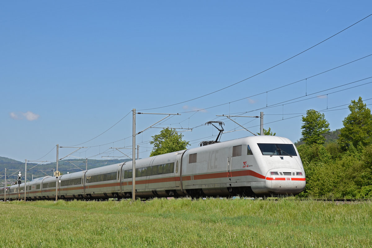 ICE 401 574-9 fährt Richtung Bahnhof Itingen. Die Aufnahme stammt vom 14.05.2019.