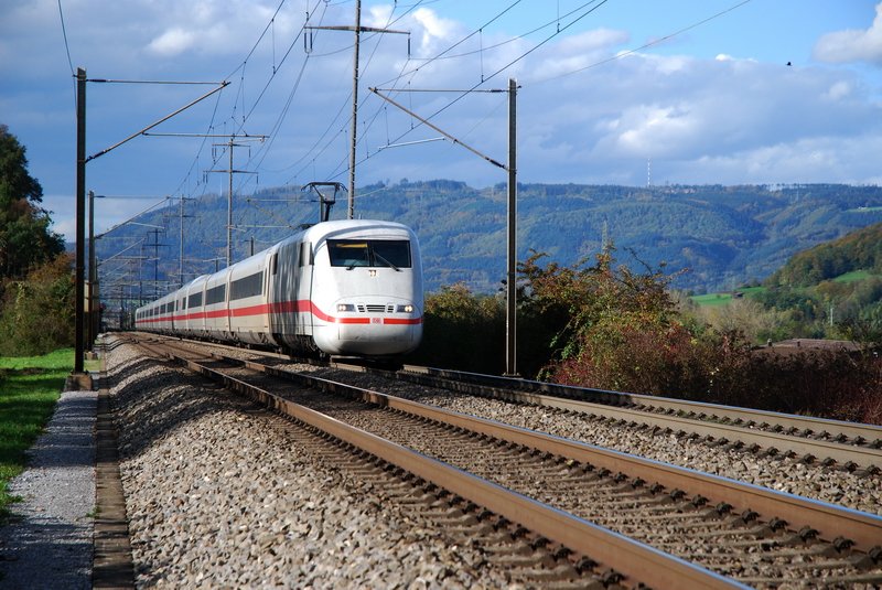 Nachschuss auf 401 574-9 "Zürich", als dieser am Nachmittag des 16.10.2019 bei der Fa. Jaocby in Auggen über die Rheintalbahn vorbei in Richtung Schliengen fuhr, als dieser auf dem Weg in die Schweiz war.
