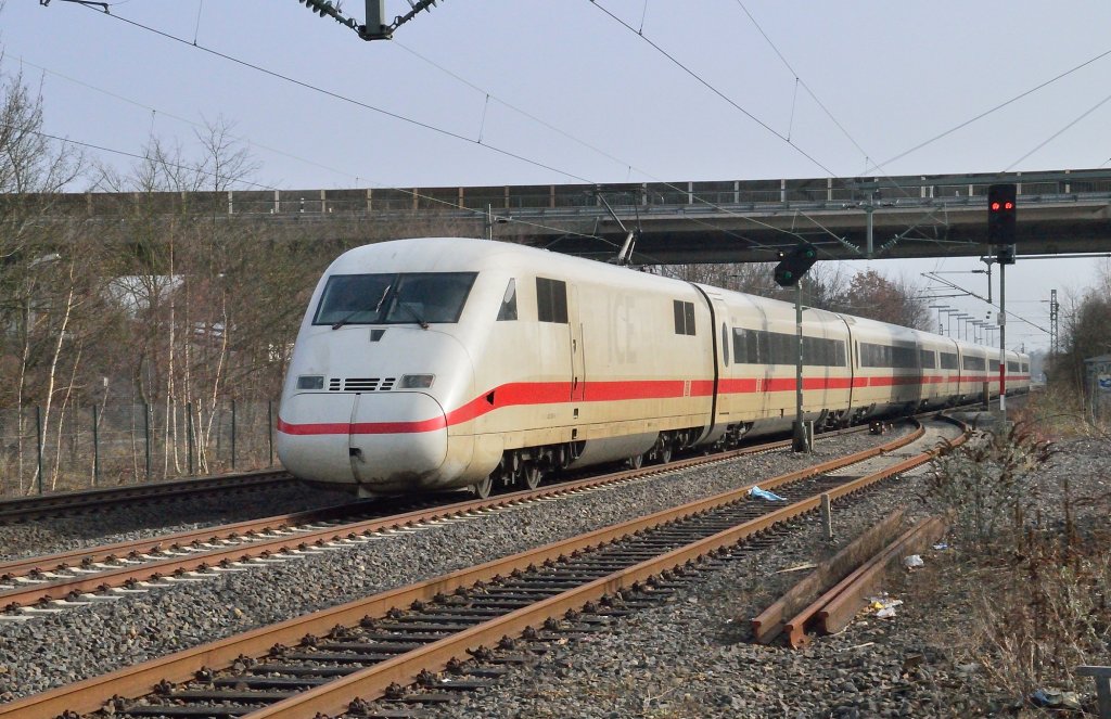 ICE Riesa 402 009-5 auf dem Weg nach Berlin Ostbahnhof, gerade hatte der Zug Mönchengladbach verlassen und fährt nun durch Korschenbroich auf dem Weg in die Hauptstadt. 17.2.2013