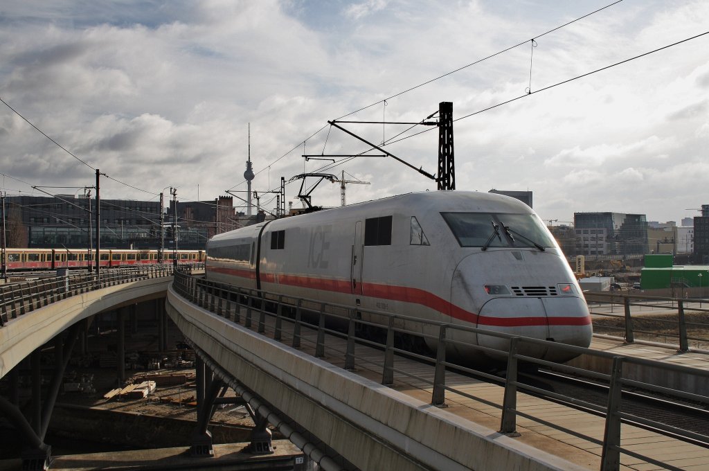 Hier 402 025-8  Altenburg  als ICE541 von Köln Hbf. nach Berlin Ostbahnhof, bei der Ausfahrt am 25.2.2012 aus Berlin Hbf.