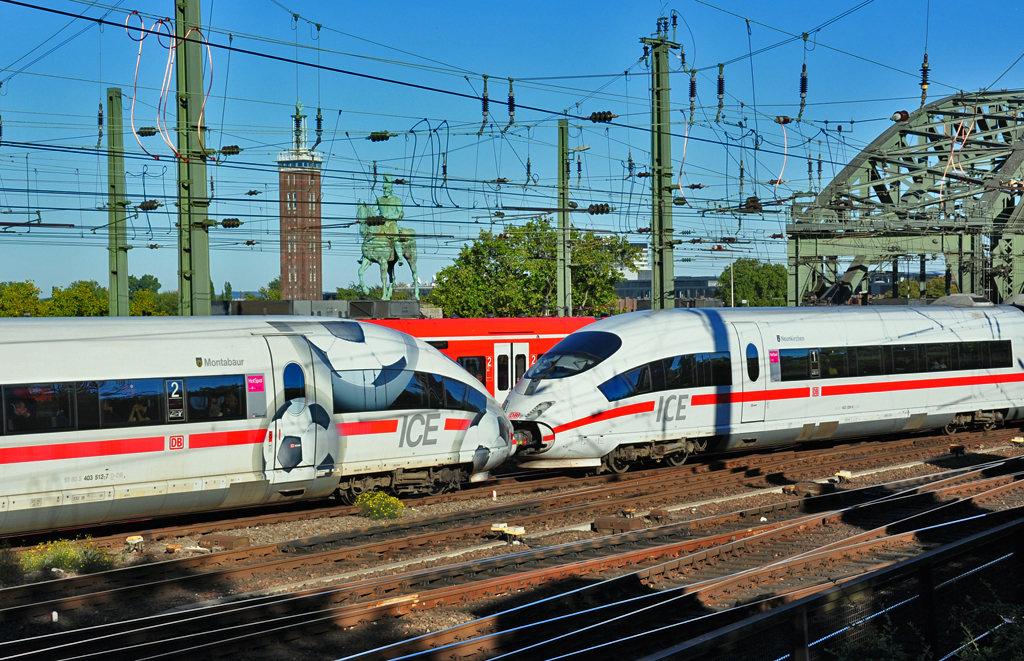 403 512-7 Montabaur ICE kurz vor Hbf Köln. Im Hintergrund Messeturm Deutz, Reiterstandbild und Hohenzollernbrücke. 10.10.2010