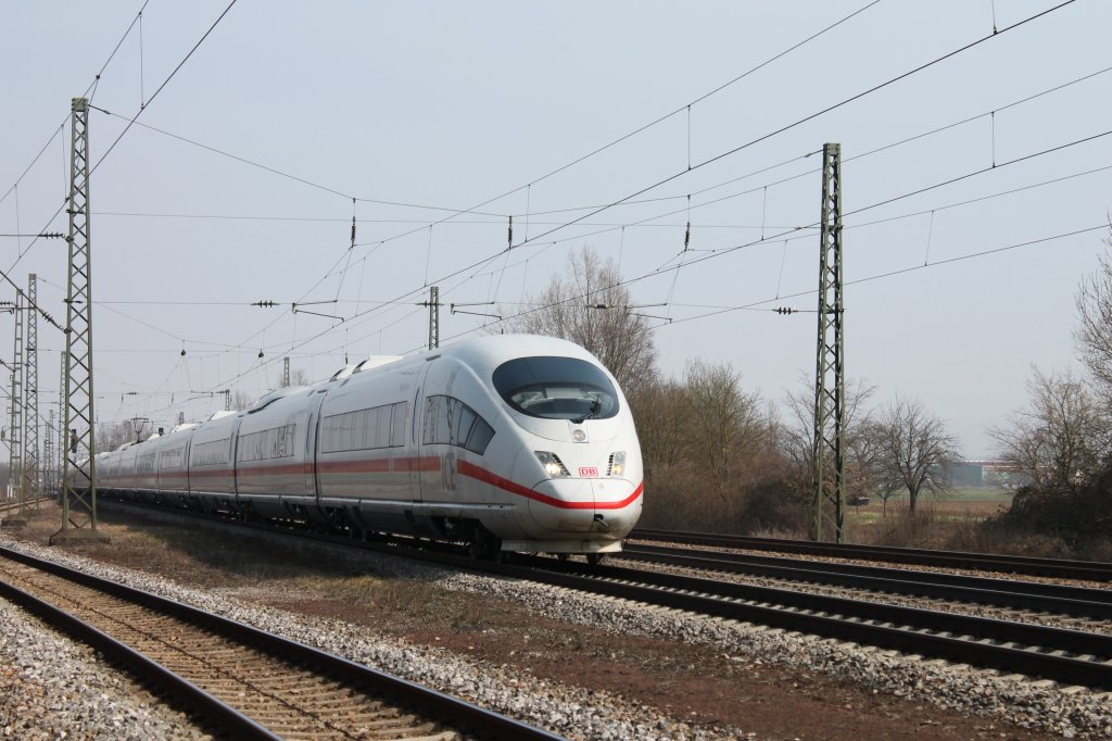 Ex. Werbe ICE 3 403 512-7 "Montabaur" am 04.04.2013 zusammen mit 403 035-9 zwischen den Überholgleisen in Orschweier gen Basel.