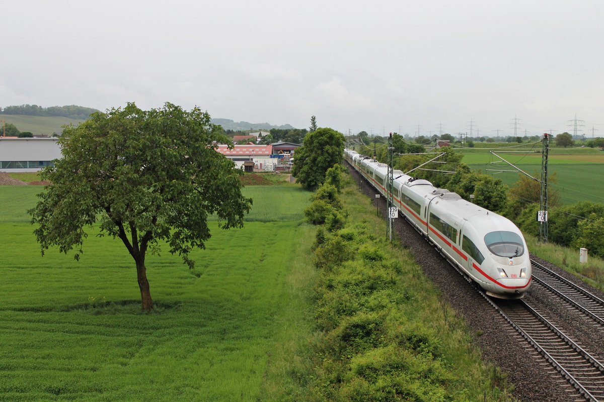 Als ICE 107 (Köln Hbf - Basel SBB) fuhr am Nachmittag des 26.05.2020 der 403 512-7  Montabaur  südlich von Buggingen über die Rheintalbahn durchs Markgräflerland in Richtung Müllheim (Baden).