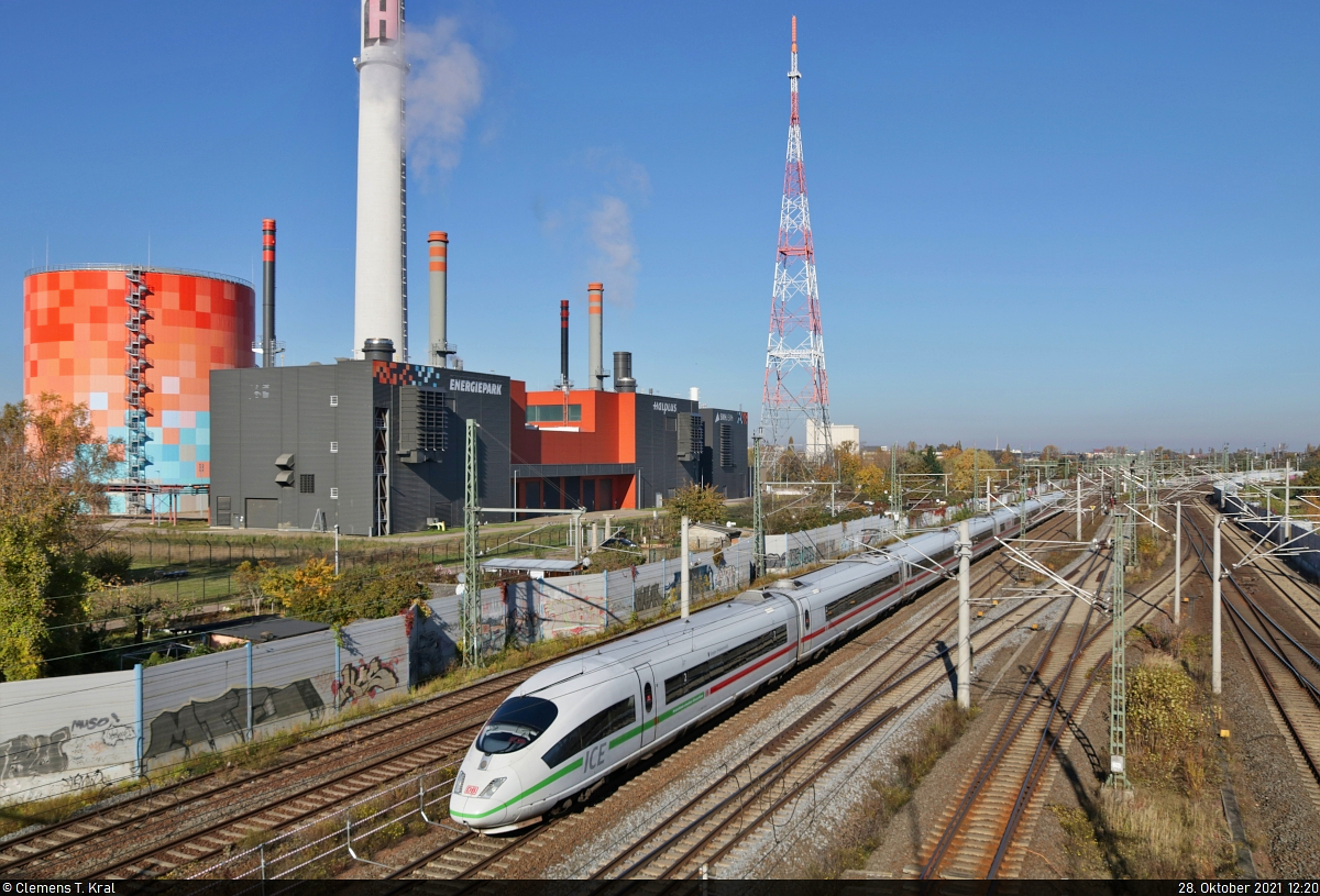 403 515-0 (Tz 315 "Singen (Hohentwiel)") unterwegs am Energiepark Dieselstraße in Halle (Saale). Aufgenommen von der Dieselbrücke. 🧰 DB Fernverkehr 🚝 ICE 932 (Linie 15) Berlin Gesundbrunnen–Frankfurt(Main)Hbf 🚩 Bahnstrecke Halle–Bebra (KBS 580) 🕓 28.10.2021 | 12:20 Uhr