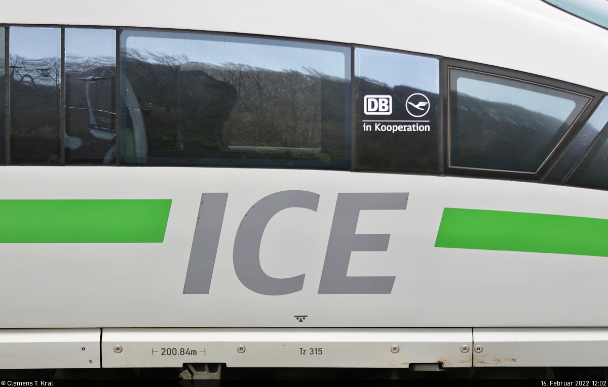 In Kooperation mit dem großen Kranich: Schriftzüge an 403 515-0 (Tz 315 "Singen (Hohentwiel)") im Bahnhof Altenbeken auf Gleis 22. 🧰 DB Fernverkehr 🚝 ICE 1223 "Westfalen" (Linie 41) Darmstadt Hbf–München Hbf [+55] 🕓 16.2.2022 | 12:02 Uhr