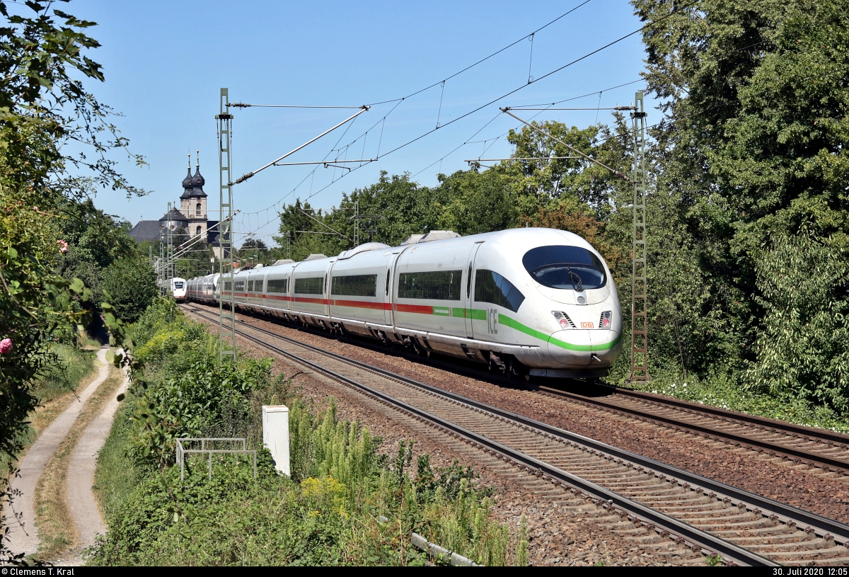 Nachschuss auf 403 524-2 (Tz 324 "Fürth") und 403 ???, womöglich als umgeleiteter und verspäteter ICE 610 (Linie 42) von München Hbf nach Dortmund Hbf, die nahe Bruchsal Schlachthof auf der Bahnstrecke Bietigheim-Bissingen–Bruchsal (Westbahn (Württemberg) | KBS 770) fahren. [30.7.2020 | 12:05 Uhr]