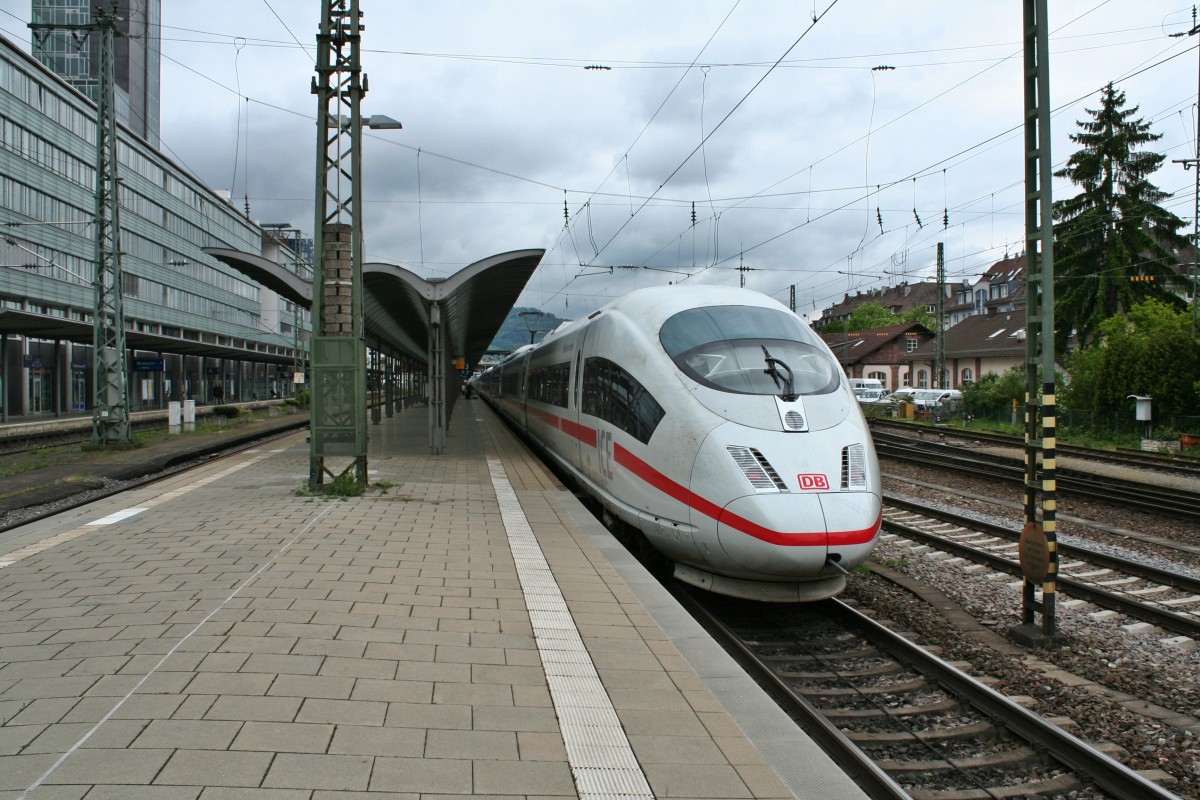 Nachschuss auf ICE 105 (Amsterdam Centraal - Basel SBB)/ICE 505 (Köln Hbf - Basel SBB) bestehend aus 406 010-9  Frankfurt am Main  und 403 533-3  Esslingen Neckar  beim Zwischenhalt in Freiburg (Brsg) Hbf.