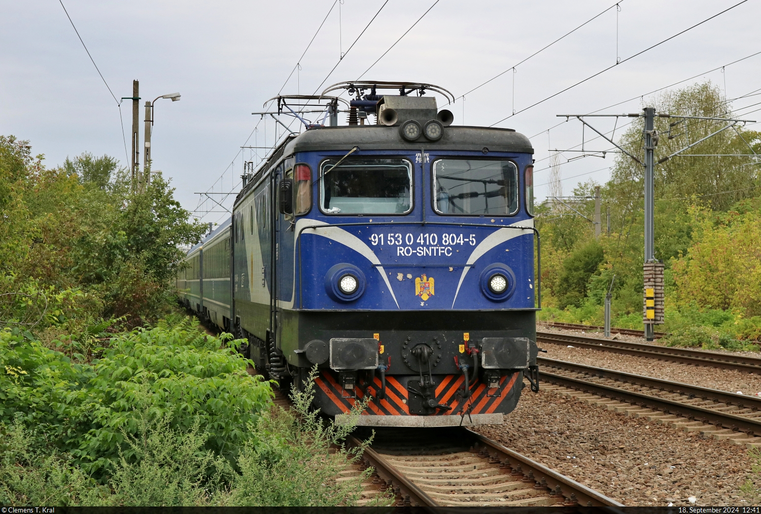 410 804-5 (91 53 0 410 804-5 RO-SNTFC) kämpft sich beim Eintreffen in den Bahnhof București Băneasa (RO) etwas durchs Grünzeug.