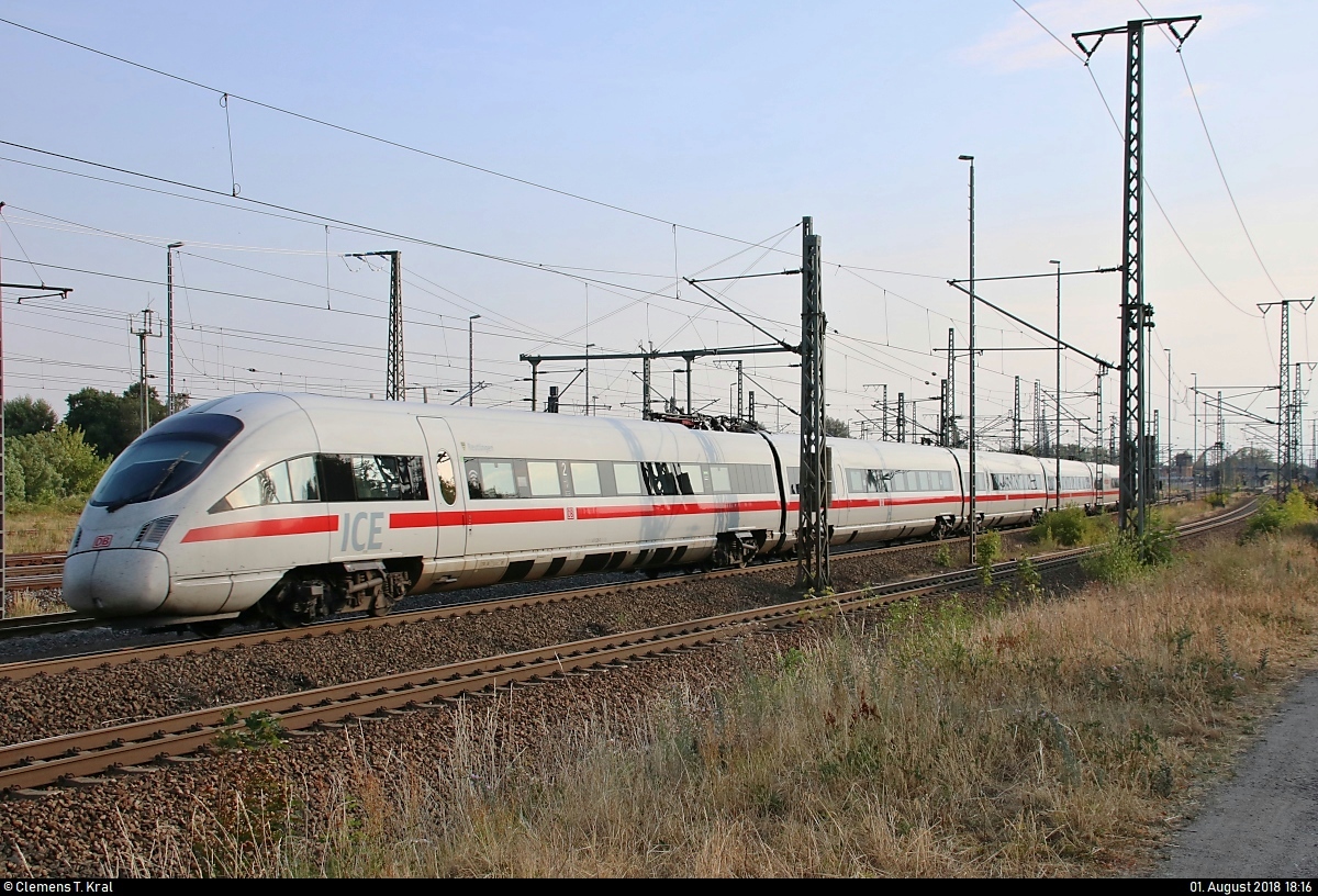 411 528-3 (Tz 1128 "Reutlingen") als ICE 1631 (Linie 15) von Frankfurt(Main)Hbf nach Berlin Gesundbrunnen durchfährt Lutherstadt Wittenberg Hbf auf Gleis 3.