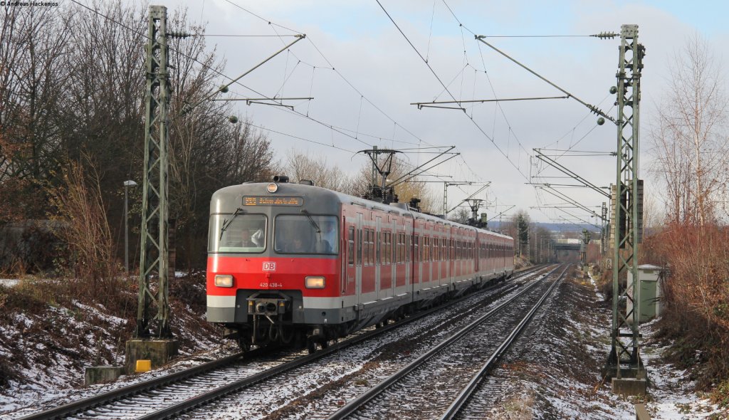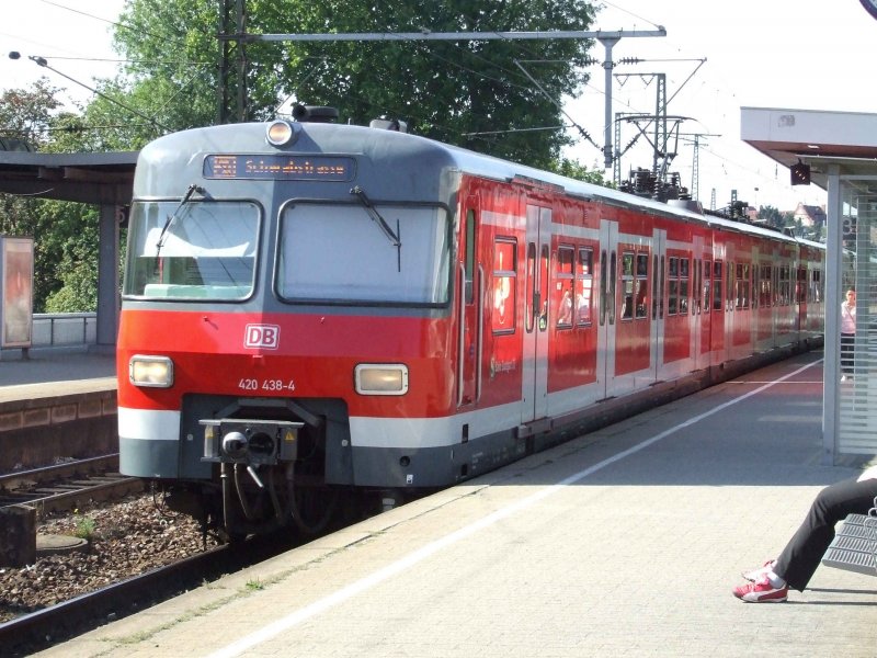 420 438-4, einer der 420er in Stuttgart, der schon auf die neuen Zugzielanzeigen umgerüstet ist, fährt im Bahnhof Ludwigsburg ein. (24.08.2007)