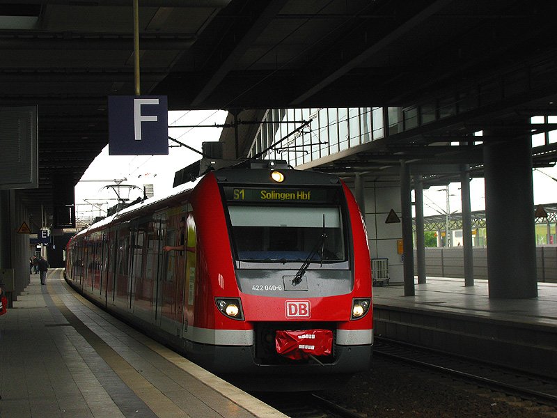 Düsseldorf Flughafen, 8.05.2010. 422 040-6 als ein Zug der Linie S1 ist gerade mit der eindrucksvollen Geschwindigkeit aus Dortmund angekommen.