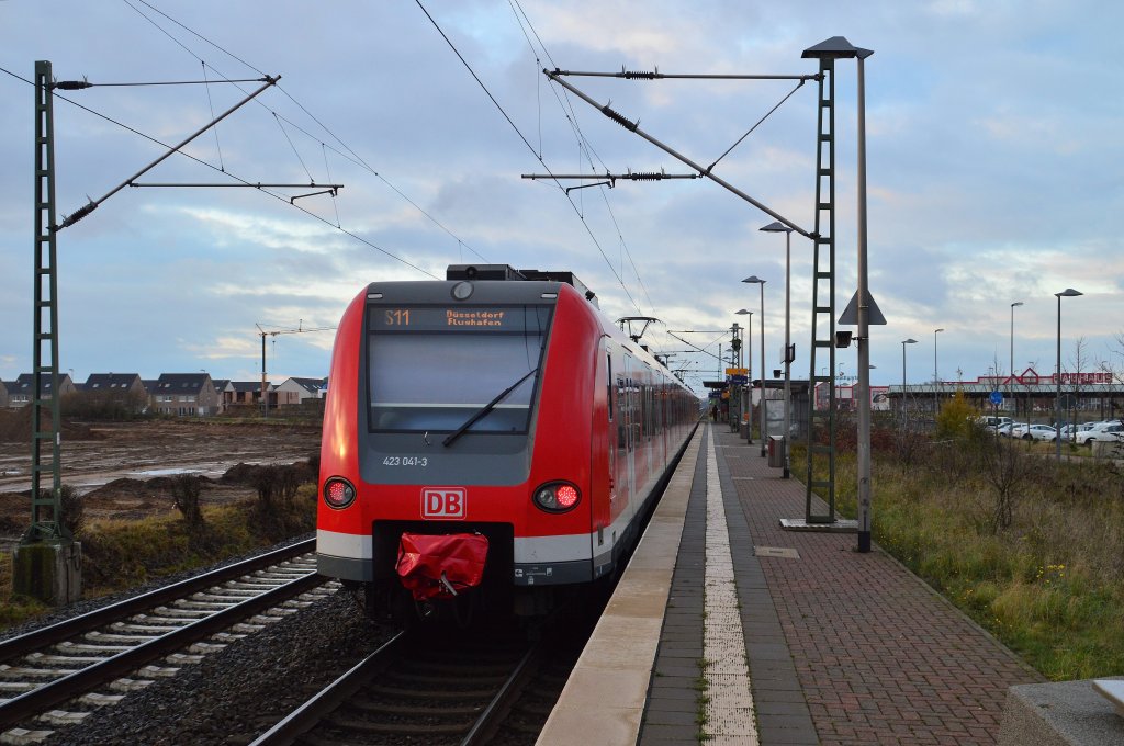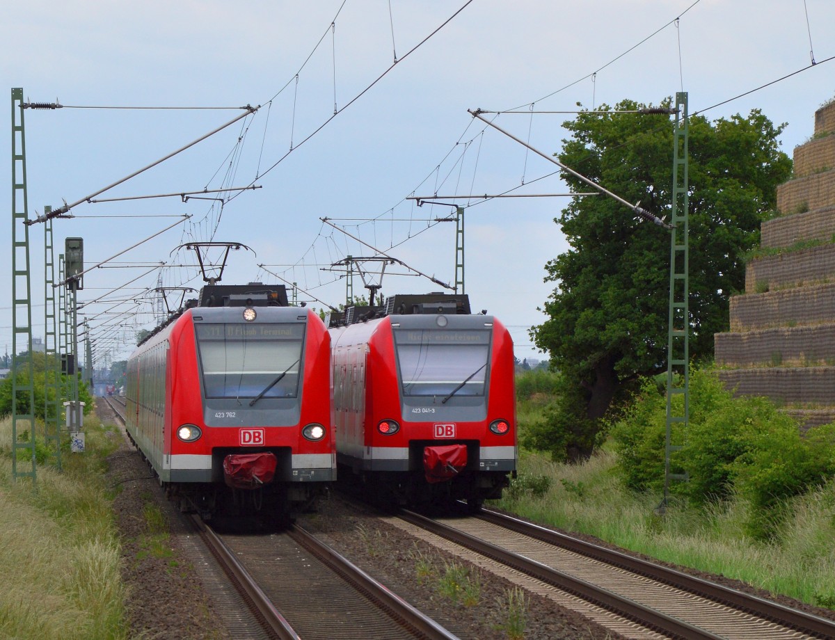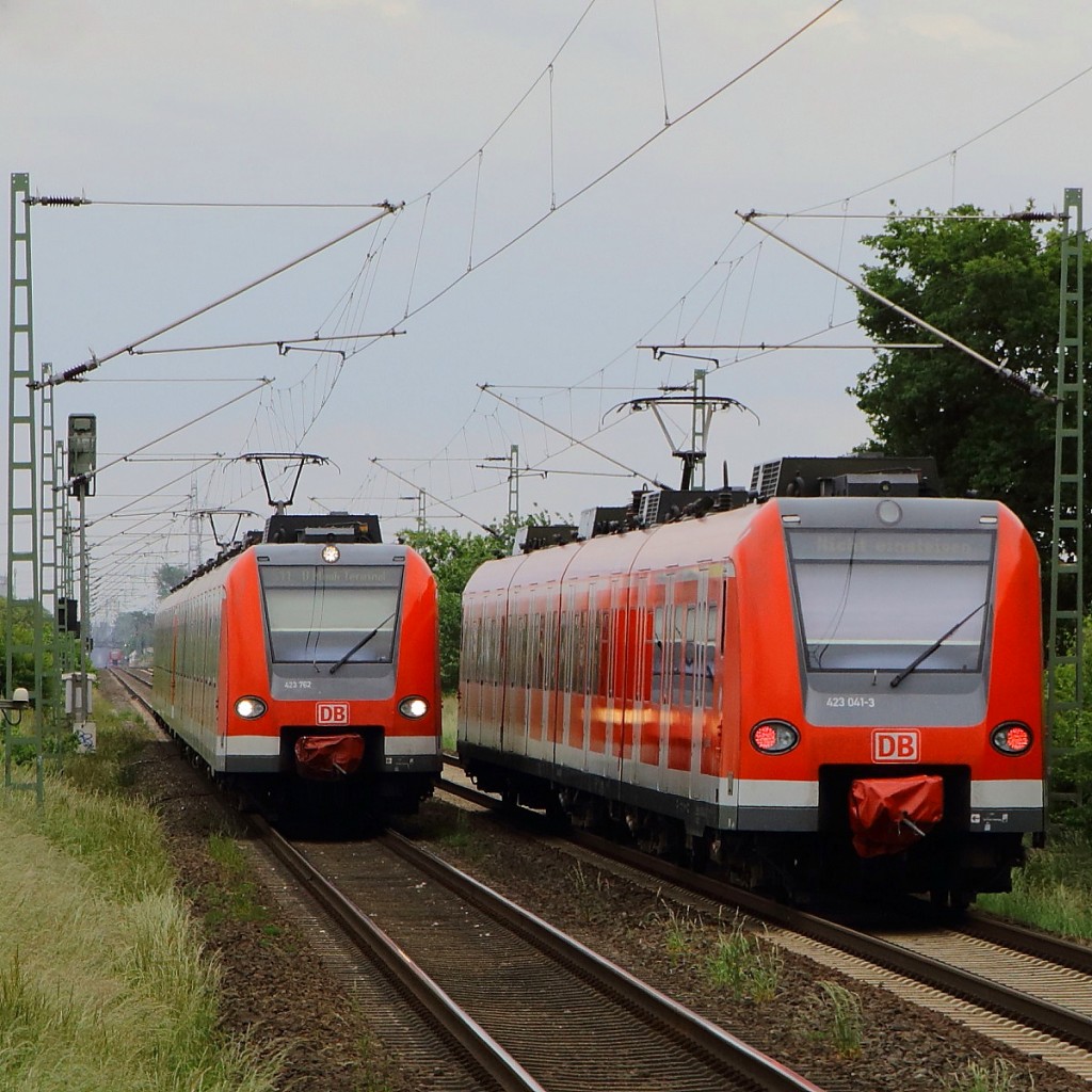Der links kommende vom 423 762 geführte Zug kommt aus Nievenheim auf seinem Weg nach Düsseldorf Flughafen. Der rechts fahrende Zug ist nach Nievenheim fahrend zu sehen, darum den Nachschuß auf den 423 041-3, der auf Dienstfahrt ist. Nicht Einsteigen steht auf dem Zielanzeiger. Freitag den 29.5.2015 Andreas Strobel