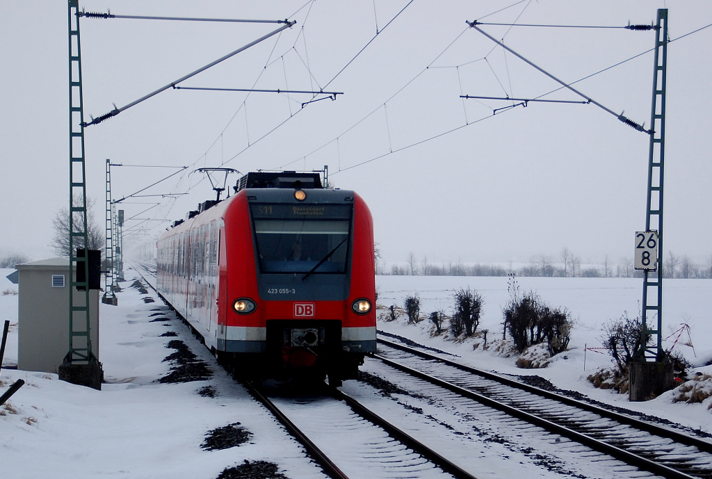 Als Kurzzug kommt diese S11 in Allerheiligen eingefahren. Es ist der Triebwagen 423 055-3 auf seinem Weg nach Düsseldorf. 31.12.2010