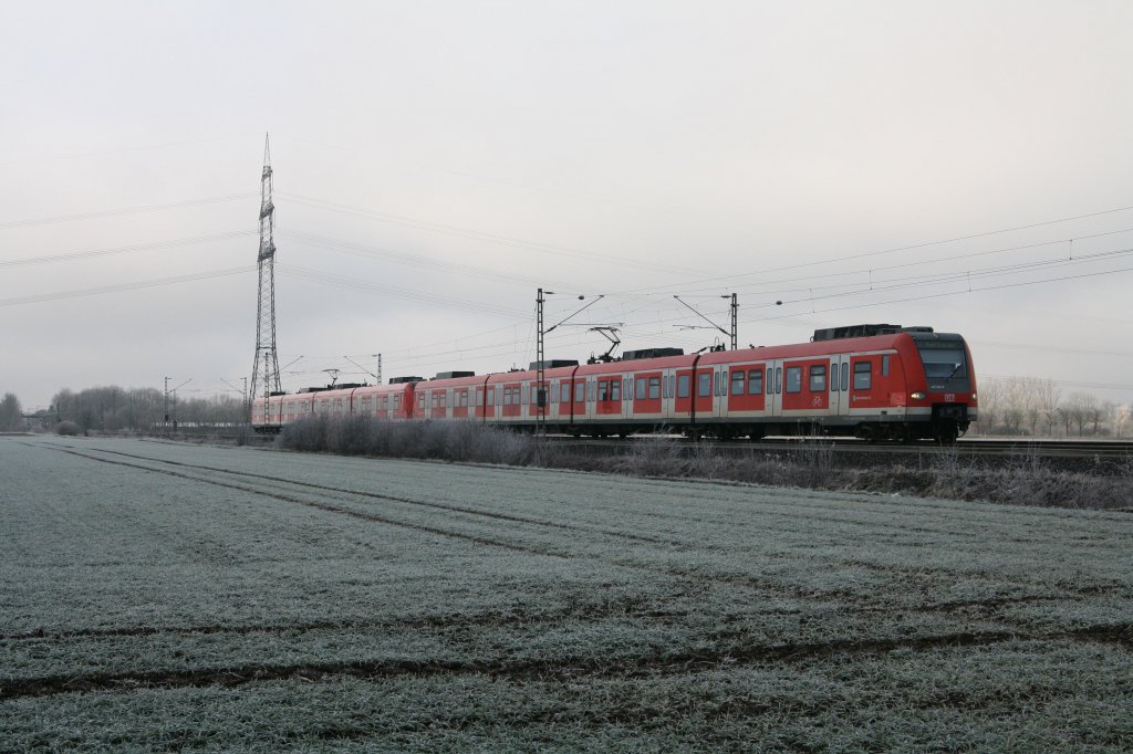 Der Hochnebel am 01.12.12 war hartnäckig, als 423 228-6 zwischen Grub und Poing nach Erding unterwegs war.