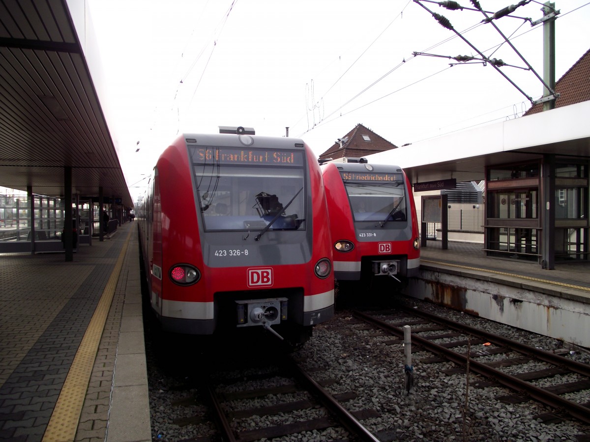 423 326-8 und 423 331-8 stehen am 18.02.14 in Frankfurt am Main Süd. Beide dieser Baureihe haben schon ein ReDesign bekommen
