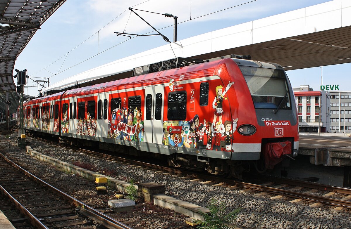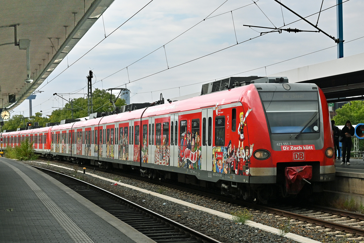 D'r Zoch ist gekommen . 423 551-1 mit Sonderlakierung Karneval bei der Einfahrt in den Bf Köln-Deutz-Messe - 15.08.2022