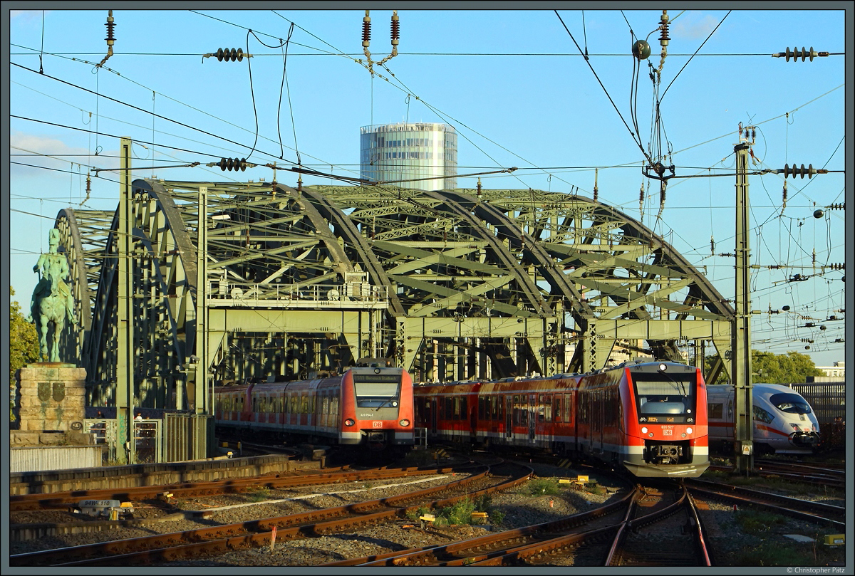 Die Hohenzollernbrücke ist die meistbefahrenste Eisenbahnbrücke Deutschlands. Am 08.10.2022 begegnen sich hier S-Bahn (423 754-1 der DB Regio als S11), Regionalverkehr (620 527 der DB Regio als RB 24) und Fernverkehr (403 xxx der DB Fernverkehr). Christopher Pätz
