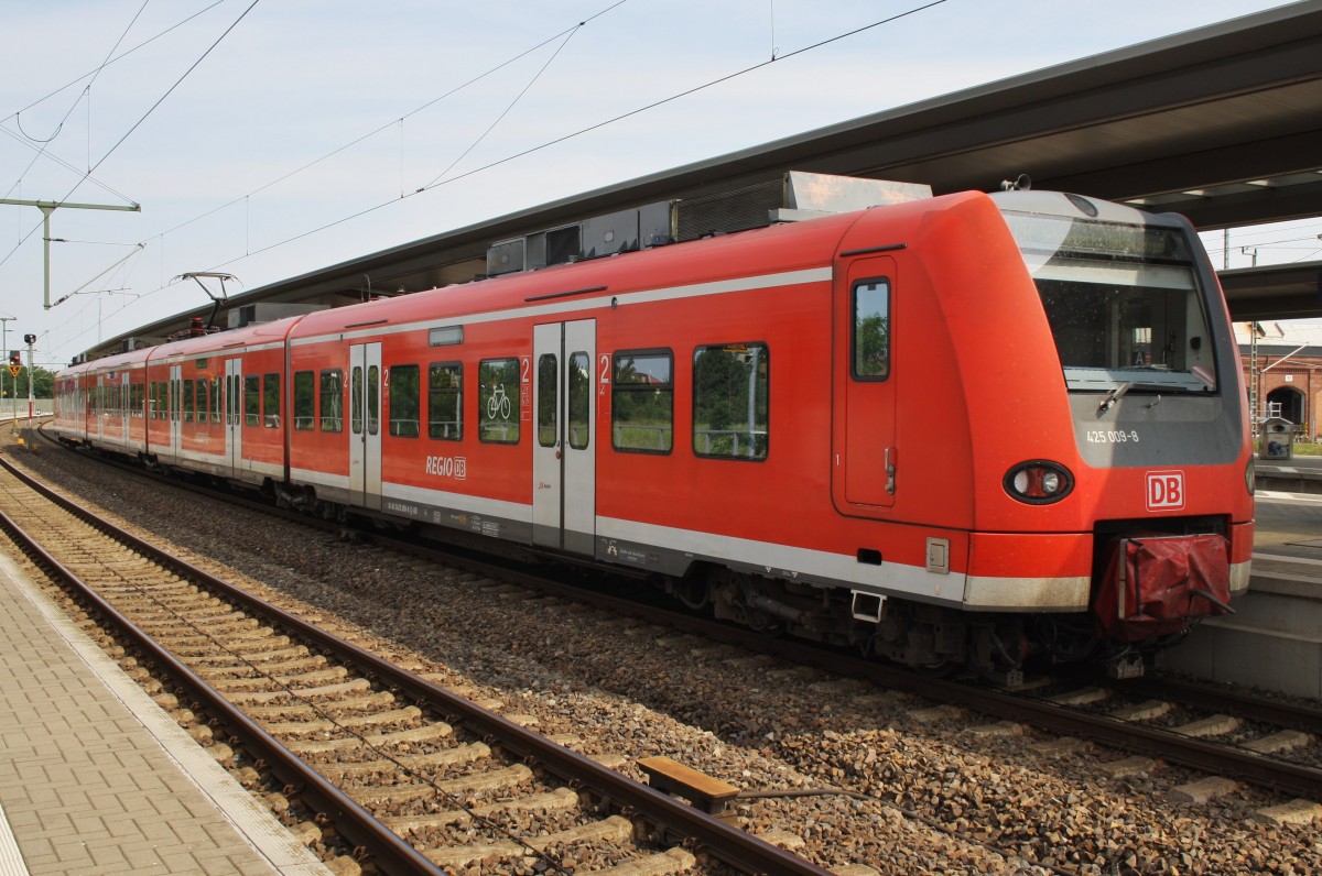 425 009-8 der S-Bahn Mittelelbe (DB Regio Südost) als S 39048 (S1) von Schönebeck-Bad Salzelmen nach Wittenberge trifft auf 146 024 der Elbe-Saale-Bahn (DB Regio Südost) als RB 16224 (RB32) von Stendal nach Salzwedel im Bahnhof Stendal.