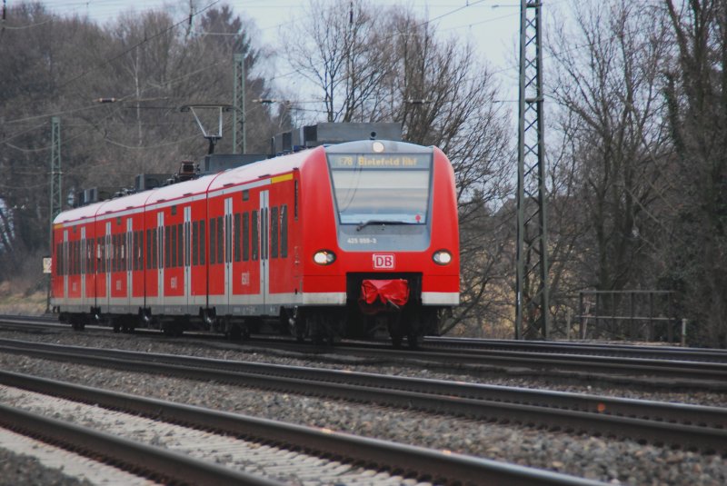 425 059-3 als RE78 hat soeben den Bhf Herford verlassen und fährt nun auf seiner Dienststrecke Nienburg - Bielefeld seinen Zielort Bielefeld an. Erwischt am 11.02.2009; heute frisch gewaschen mit noch schön verpackter Kupplung. Stephan Kühlmann