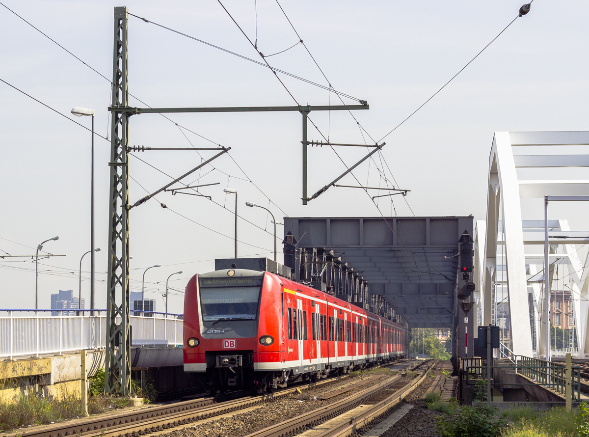 425 209-4 und ein weiterer Triebzug haben gerade den Rhein zwischen Mannheim und Ludwigshafen (Rhein) überquert und fahren in die Station Ludwigshafen (Rhein)-Mitte ein. Die Fahrt geht weiter als S1 der S-Bahn Rhein-Neckar nach Homburg (Saar). Aufgenommen am 30.08.2013. Sebastian B.