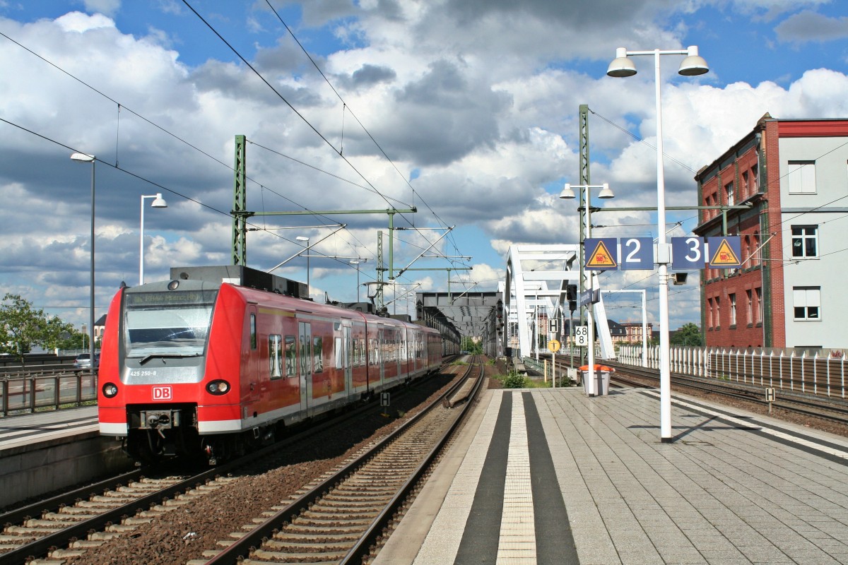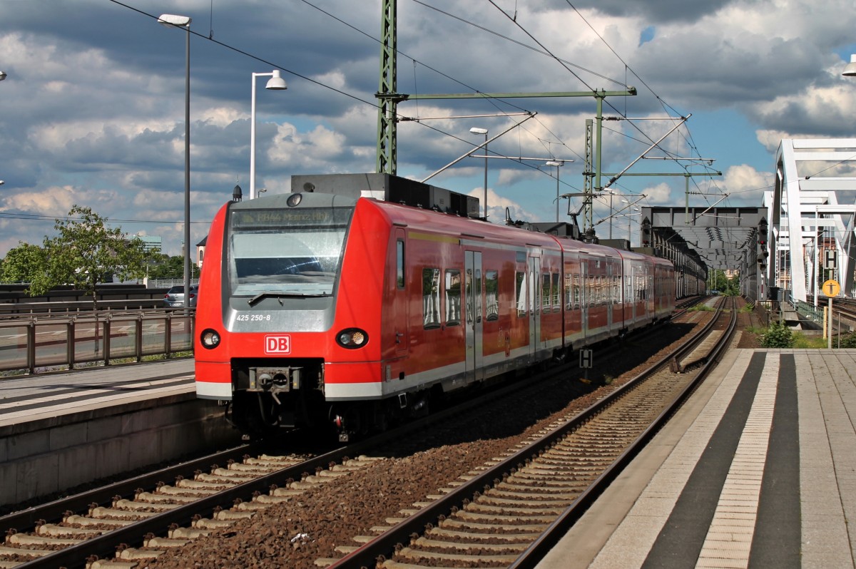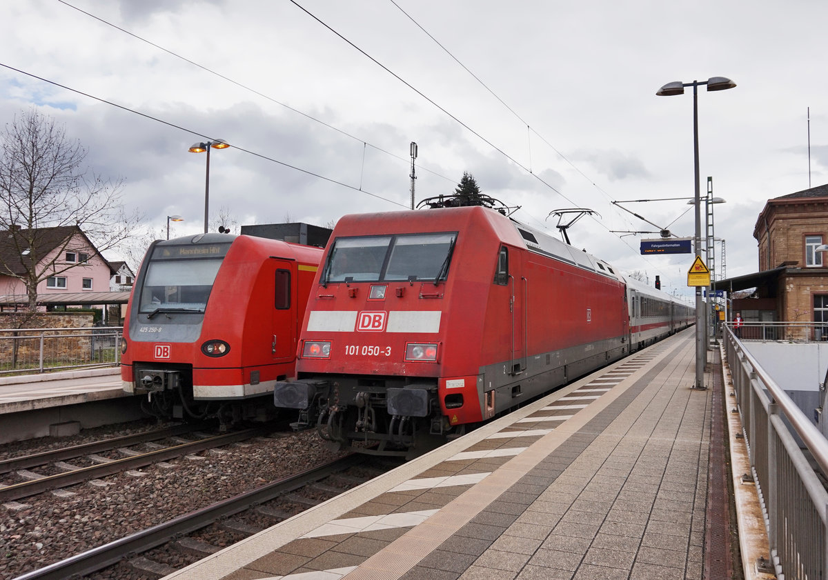 Während rechts der EC 390 (Linz Hbf - Salzburg Hbf - Frankfurt (Main) Hbf), mit 101 050-3 als Schublok, durchfährt, fährt links 425 250-8 als RB 38625 (Bensheim - Mannheim Hbf) in den Bahnhof ein.