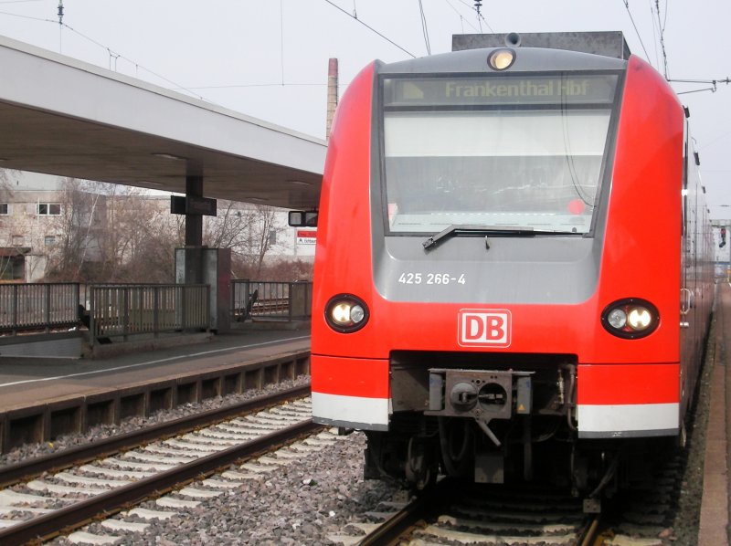 425 266-4 steht (wegen Bauarbeiten zwischen Frankenthal und Worms) auf dem Gegengleis. Dieser Zug endete aufgrund dieser Bauarbeiten in Frankenthal Hbf, hier auf Gleis 1.