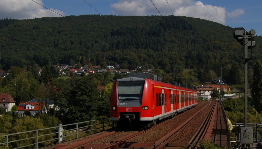 425 269-8 als RE, Heilbronn Hbf - Mannheim Hbf, auf der Neckarbrücke in Neckargemünd. Der RE wird gleich den Haltepunkt Neckargemünd-Altstadt durchfahren, von dessen Bahnsteig aus auch dieses Bild entstand, und bald seinen nächsten Halt Heidelberg Hbf erreichen. 20.09.2012 Christian Kühn